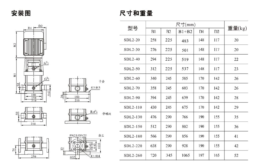SDL2/SDLT2為配用標準電機的非自吸立式多級離心泵,電機軸和泵軸用聯(lián)軸器直接聯(lián)接,把拉桿用螺母將外筒,過流部件固定在支架和進出水體之間,泵進出水口在泵底部的同一直線上。泵可根據需要配置智能保護器,對泵的干轉、缺相、過載等進行有效的保護。